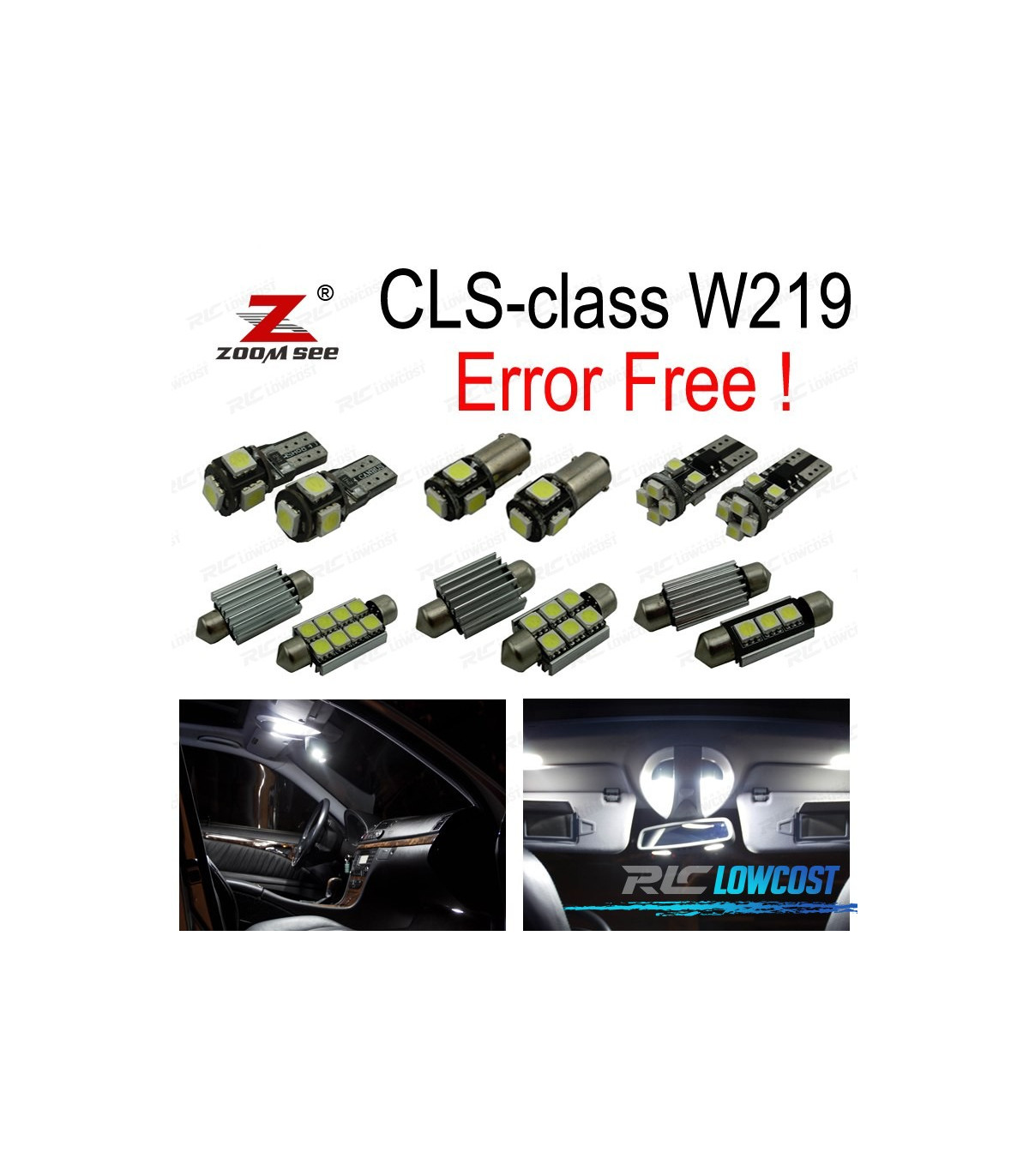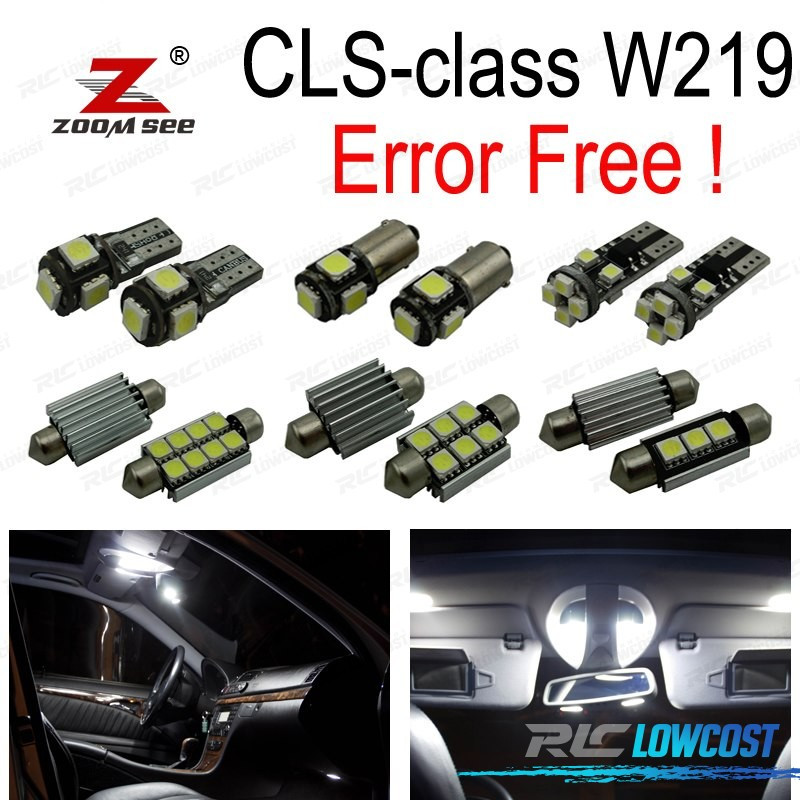 Bombillas led de Alta calidad, Súper brillante. Instalación sencilla: no es necesario ningún tipo de modificación, simplemente sustituir las bombillas led por las que trae el vehículo de origen. Disponen de sistema Can bus: no se encenderá aviso de luz fundida en cuadro. Diseñadas para una perfecta resistencia al calor. Color: Luz blanca led Larga duración: hasta 50,000 horas *Si las bombillas no funcionan, por favor gire 180 grados para que funcionen, tienen posición. Este kit se adapta a: CLS-clase W219: CLS500, CLS55AMG, CLS550, CLS63AMG (2006-2010) El paquete incluye:Bombillas cúpula frontal-4 unidadesCúpula trasera/luces de mapa-4 unidadesBombillas parasol-2 unidadesBombillas plafón central-1 unidadesBombillas guantera-1 unidadesBombillas matrícula-2 unidadesBombillas puertas-4 unidadesBombillas reposapiés-4 unidadesBombillas reserva extra-1 unidades(Cada bombilla está empaquetada y etiquetada por separado, usted sabrá donde colocar cada bombilla)
