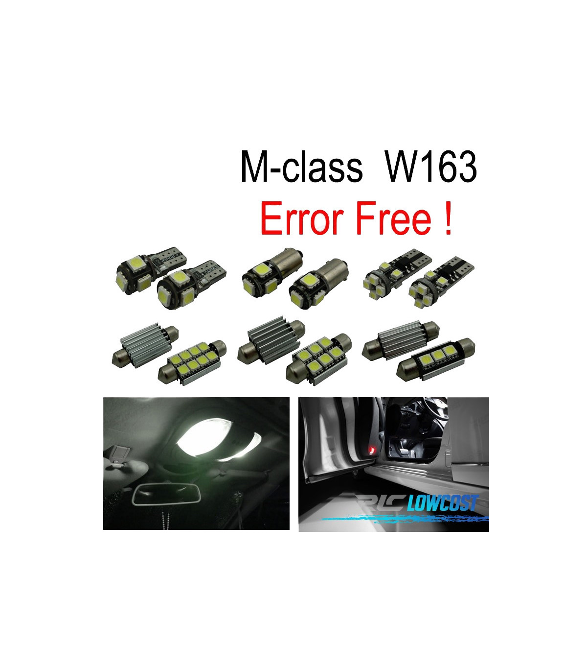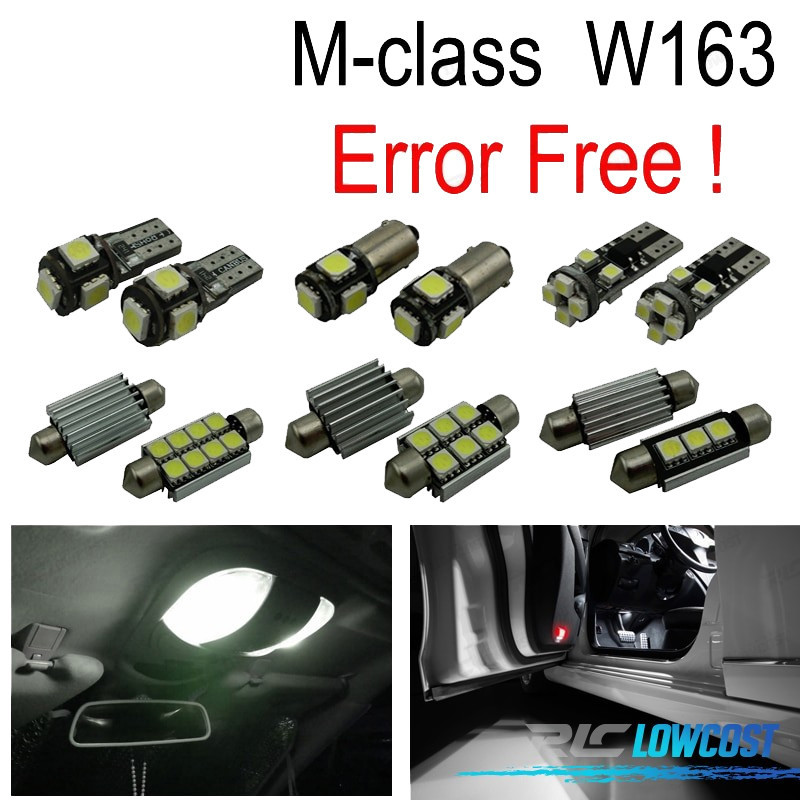 Bombillas led de Alta calidad, Súper brillante. Instalación sencilla: no es necesario ningún tipo de modificación, simplemente sustituir las bombillas led por las que trae el vehículo de origen. Disponen de sistema Can bus: no se encenderá aviso de luz fundida en cuadro. Diseñadas para una perfecta resistencia al calor. Color: Luz blanca led Larga duración: hasta 50,000 horas *Si las bombillas no funcionan, por favor gire 180 grados para que funcionen, tienen posición. Este kit se adapta a: Clase-M W163: ML320... ML350... ML430... ML500... ML55AMG (1998-2005) El paquete incluye:Bombillas cúpula frontal-2 unidadesBombillas Cúpula trasera-3 unidadesBombillas parasol-2 unidadesBombillas puertas-4 unidadesBombillas reposapiés-2 unidadesBombillas maletero-1 unidadesBombillas guantera-1 unidades(Cada bombilla está empaquetada y etiquetada por separado, usted sabrá donde colocar cada bombilla)
