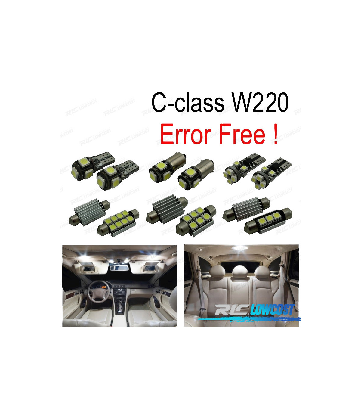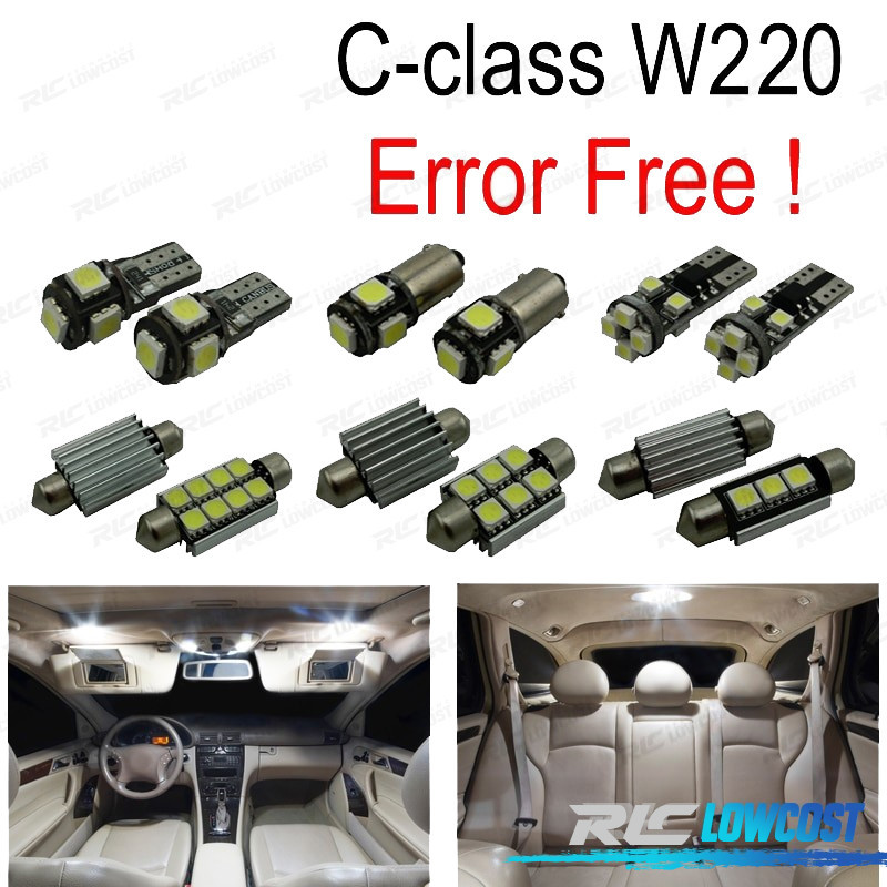 Bombillas led de Alta calidad, Súper brillante. Instalación sencilla: no es necesario ningún tipo de modificación, simplemente sustituir las bombillas led por las que trae el vehículo de origen. Disponen de sistema Can bus: no se encenderá aviso de luz fundida en cuadro. Diseñadas para una perfecta resistencia al calor. Color: Luz blanca led Larga duración: hasta 50,000 horas *Si las bombillas no funcionan, por favor gire 180 grados para que funcionen, tienen posición. Este kit se adapta a: Clase S w220 (1999-2005): s320, S420, S430, s500, S600, s55 El paquete incluye: Bombillas cúpula frontal-4 unidades Bombillas Cúpula trasera-4 unidades Bombillas parasol-2 unidades Bombillas puertas-4 unidades Bombillas reposapiés-4 unidades Bombillas guantera-1 unidades Bombillas plafón central-3 unidades Bombillas matrícula-2 unidades (Cada bombilla está empaquetada y etiquetada por separado, usted sabrá donde colocar cada bombilla)
