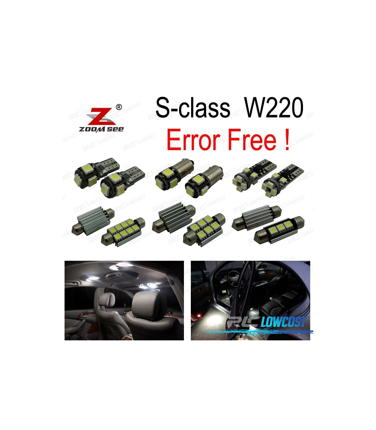 Bombillas led de Alta calidad, Súper brillante. Instalación sencilla: no es necesario ningún tipo de modificación, simplemente sustituir las bombillas led por las que trae el vehículo de origen. Disponen de sistema Can bus: no se encenderá aviso de luz fundida en cuadro. Diseñadas para una perfecta resistencia al calor. Color: Luz blanca led Larga duración: hasta 50,000 horas *Si las bombillas no funcionan, por favor gire 180 grados para que funcionen, tienen posición. Este kit se adapta a: Clase S W220 (1999-2005): S320, S350, S400, S420, S430, S500, S600, S55AMG, S63AMG, S65AMG El paquete incluye:Bombillas cúpula frontal-4 unidadesBombillas Cúpula trasera-4 unidadesBombillas parasol-2 unidadesBombillas puertas-4 unidadesBombillas reposapiés-4 unidadesBombillas guantera-1 unidadesBombillas plafón central-3 unidades(Cada bombilla está empaquetada y etiquetada por separado, usted sabrá donde colocar cada bombilla)