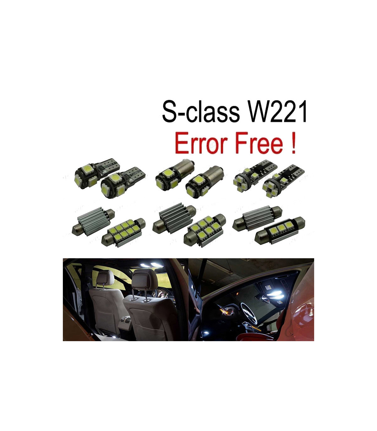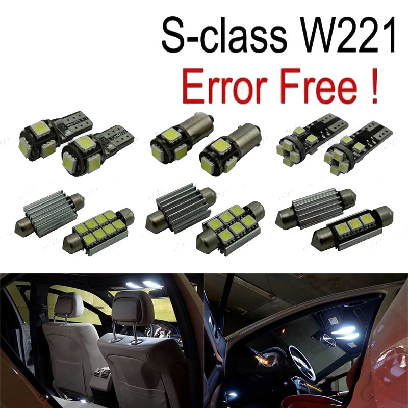 Bombillas led de Alta calidad, Súper brillante. Instalación sencilla: no es necesario ningún tipo de modificación, simplemente sustituir las bombillas led por las que trae el vehículo de origen. Disponen de sistema Can bus: no se encenderá aviso de luz fundida en cuadro. Diseñadas para una perfecta resistencia al calor. Color: Luz blanca led Larga duración: hasta 50,000 horas *Si las bombillas no funcionan, por favor gire 180 grados para que funcionen, tienen posición. Este kit se adapta a: Clase S W221 (2006-2013): S250, S280, S300, S320, S350, s400, S420, S450, S500, S550, S600, S63AMG, S65AMG El paquete incluye: Bombillas cúpula frontal-4 unidades Cúpula trasera/luces de mapa-4 unidades Bombillas parasol-2 unidades Bombillas plafón central-3 unidades Bombillas guantera-1 unidades Bombillas reposapiés-4 unidades Bombillas puertas-4 unidades Bombillas matrícula-2 unidades Bombillas reserva extra-2 unidades(Cada bombilla está empaquetada y etiquetada por separado, usted sabrá donde colocar cada bombilla)