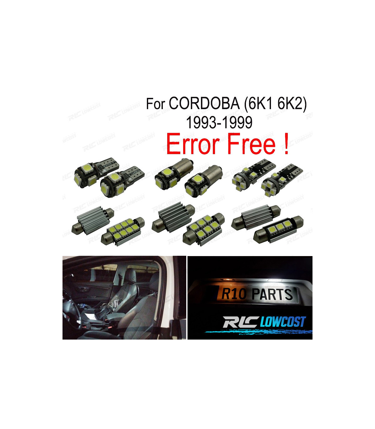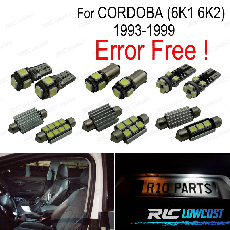 Bombillas led de Alta calidad, Súper brillante. Instalación sencilla: no es necesario ningún tipo de modificación, simplemente sustituir las bombillas led por las que trae el vehículo de origen. Disponen de sistema Can bus: no se encenderá aviso de luz fundida en cuadro. Diseñadas para una perfecta resistencia al calor. Color: Luz blanca led Larga duración: hasta 50,000 horas *Si las bombillas no funcionan, por favor gire 180 grados para que funcionen, tienen posición. Este kit se adapta a: Para Córdoba (6K1, 6K2)(1993-1999) El paquete incluye:Bombillas cúpula frontal-3 unidadesBombillas plafón central-1 unidadesLicencia Plate-2 unidadesBombillas laterales-2 unidadesBombillas posición-2 unidadesBombillas reserva extra-1 unidades(Cada bombilla está empaquetada y etiquetada por separado, usted sabrá donde colocar cada bombilla).